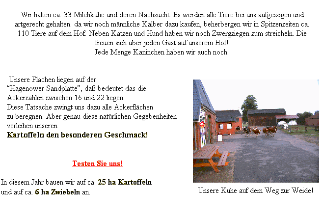 Wir bewirtschaften einen landwirtschaftlichen Vollerwerbsbetrieb in Besenthal. ( Kreis Herzogtum Lauenburg) Auf unseren Flächen bauen wir Roggen, Gerste, Zwiebeln, Silomais und natürlich Speisekartoffeln an. Wir nutzen das natürliche Grünland für die